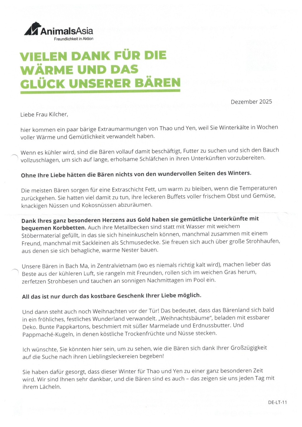 Bei der letzten Gesundheitskontrolle vor einem Jahr stellten wir fest, dass Thao Anzeichen von Hypertonie (Bluthochdruck) aufwies. Da Bluthochdruck ein lebenslanges Leiden ist, gaben wir ihm täglich blutdrucksenkenede Medikamente, um seinen Zusand zu stabilisieren. Dieses Mal kam er wieder in unser Krankenhaus, um seinen Zustand erneut zu überprüfen und auch unseren Medikationsplan neu zu bewerten. Nach unseren Standarduntersuchungen, einschliesslich der Untersuchung der Netzhaut, der Röntgenaufnahme des Brustkorbs und des Herzultraschalls (Echo), konnten wir bestätigen, dass sein Bluthochdruck stabil ist und mit den derzeitigen Medikamenten gut eingestellt werden kann. Daher wird er in 2 Jahren zu einem routinemässigen Gesundheitscheck in unser Krankenhaus zurückkehren, wie es für alle Bären in unserrem Rettungszentrum vorgesehen ist. Wir haben auch eine alte abnorme Wucherung in seinem Rektrum untersucht, die von der Grösse her ähnlich aussieht wie beim letzten Gesundheitscheck, so dass wir sie beim nächsten Check weiter beobachten werden. Ausserdem wurden heute ein Ultraschall des Bauches und eine Untersuchung der Beweglichkeit durchgeführt, um sicherzustellen, dass sich keine anderen Probleme in ihm verbergen. Seine Genesung verlief gut und er bekam für sein gutes Mitmachen eine Menge leckeres Futter und Leckerlis serviert :-) Am nächsten Tag konnte Thao zurückkehren in sein Bärenhaus und zu seinen Kumpels.