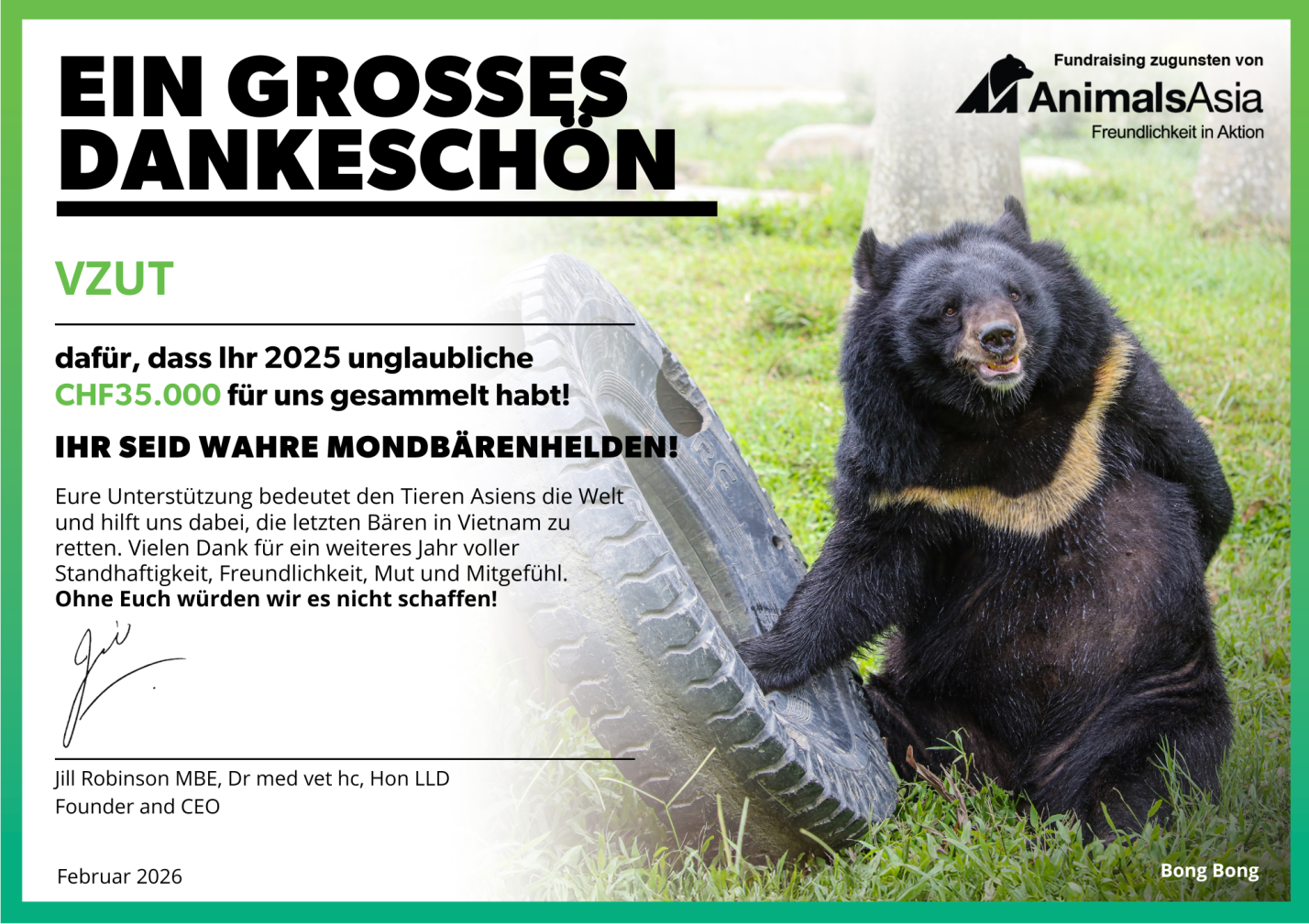Animals Asia rettet einen jungen Mondbären nach nur 12 Stunden Vorbereitungszeit - Nach einem Notruf des Amts für Waldschutz am 11. April 2021 lässt das Team von AAF alles stehen und liegen um für die Ankunft von "Lam" bereit zu sein. Lam bedeutet auf Vietnamesisch "Wald", ein Gedenken an den Lebensraum, den man diesem Bären auf grausame Art verweigert hat. Ab heute ist "Lam" kein "Nirgendwo-Bär" mehr sondern ein Jemand, der für den Rest seines Lebens geliebt wird und das auch dank der Hilfe des VZUT's mit Ramona's Online-Flohmi und seinen Spenderinnen und Spendern, herzlichen Dank!